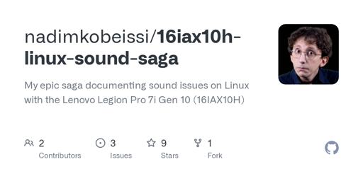 Sunshine (she/her)@lemmy.caEnglish · 6 hours ago$830 Bug Bounty to Whoever Fixes the Lenovo Legion Pro 7 16IAX10H's Speakers on Linuxplus-squaregithub.comexternal-linkmessage-square6linkfedilinkarrow-up184arrow-down10