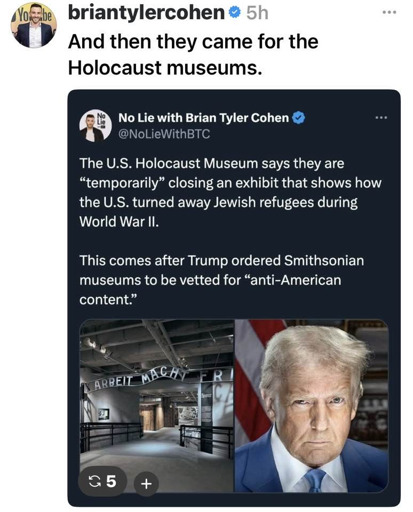 Ironically the US Holocaust Museum is basically a part of Israel’s PR wing and has done extensive work in whitewashing Israel’s modern-day Holocaust in Palestine, even saying that “Never again” only means “never again for Jews” and genocides of other people is OK. It should be shut down for that reason, not Trump’s.