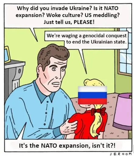 My problem with your meme is not, that I believe Russia is right, my problem with your meme is, that it makes it seem like Russia is not using NATO westward expansion a excuse to justify their illegal war to their own population and their international partners, which it absolutely does and has been since decades.
