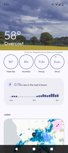 My favorite feature is the radar view, which is just as snappy and intuitive as the rest of the app. Press play to see the recent radar animated, or tap to see it in full screen view and look around. It can be super helpful in looking out for incoming weather, or visualizing how quickly a shower will blow over. And it’s something conspicuously missing from some other apps.