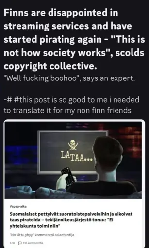lanigerous@feddit.uk to Piracy: ꜱᴀɪʟ ᴛʜᴇ ʜɪɢʜ ꜱᴇᴀꜱ@lemmy.dbzer0.comEnglish · edit-24 days agoGood old Finland (subtitle is commentary, not in text)lemmy.blahaj.zoneimagemessage-square32fedilinkarrow-up1472arrow-down16file-text
