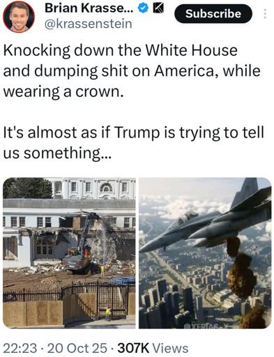 In a military jet. With the words “King Trump” painted on it. While wearing a crown of gold.