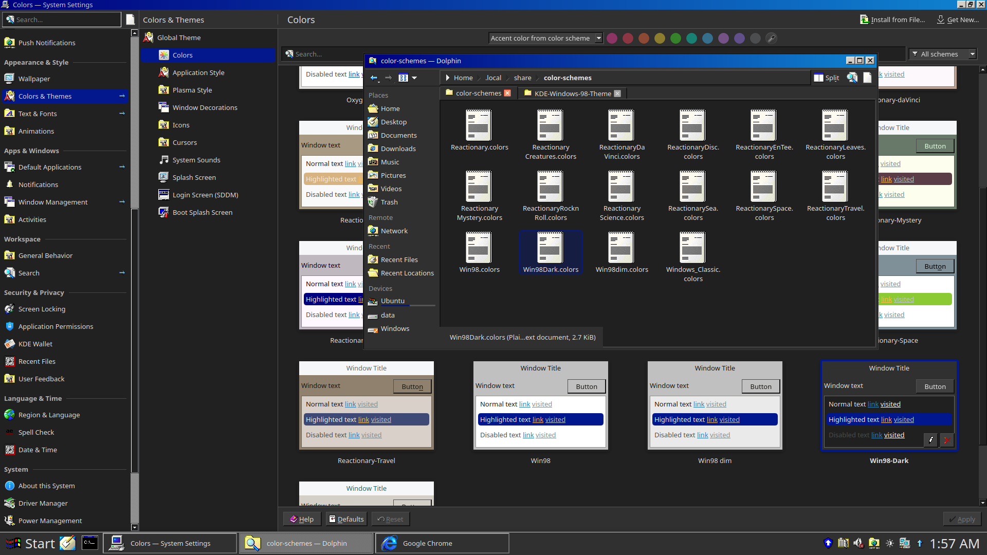To install this, open System Settings, go to Colors & Themes -> Global Theme. In the top right there’s a button for “Get New…”, wait for it to load (it’s very slow) then search for reactionary, and wait again, then install Reactionary 98.