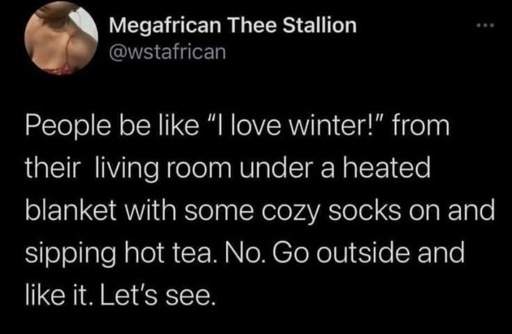 arrow-up1558arrow-down1imageWinter loverslemmy.worldickplant@lemmy.world to Microblog Memes@lemmy.worldEnglish · 12 days agomessage-square133linkfedilink