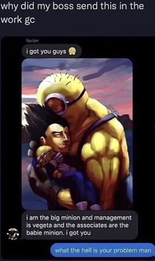 UnGlasierteGurke@feddit.org to Lemmy Shitpost@lemmy.world · 11 days agoDoes your boss even love you if he doesn't portray himself as the big minion and you as a baby minion?feddit.orgimagemessage-square23linkfedilinkarrow-up1402arrow-down14