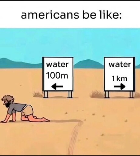 The previous edit to this joke was the American man dying of thirst went to the right because 1<100 and as a math illiterate, he didn’t check the units.