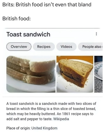 and that applies to all the british (and “white people” food in general) that people think is boring, yeah it’s boring because the main goal was not starving to death…