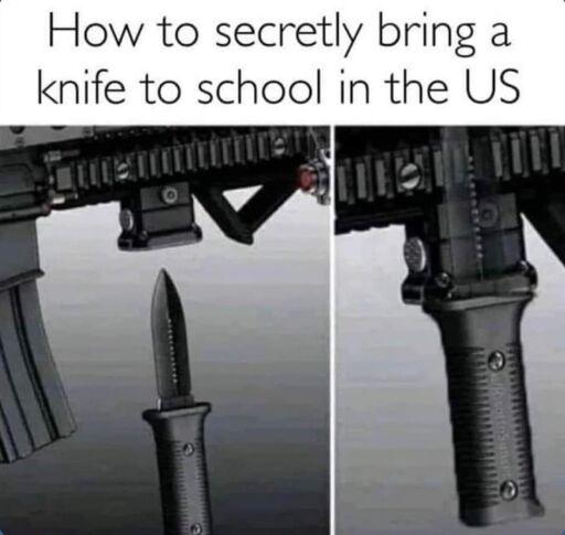 This is a bad idea. The placement of the angled foregrip on that AR makes me think it’s a pistol-length upper. This knife handle is functioning as a vertical foregrip, which is a felony without the proper tax stamp. If you bring this knife to school, you’re going to be charged with a felony.